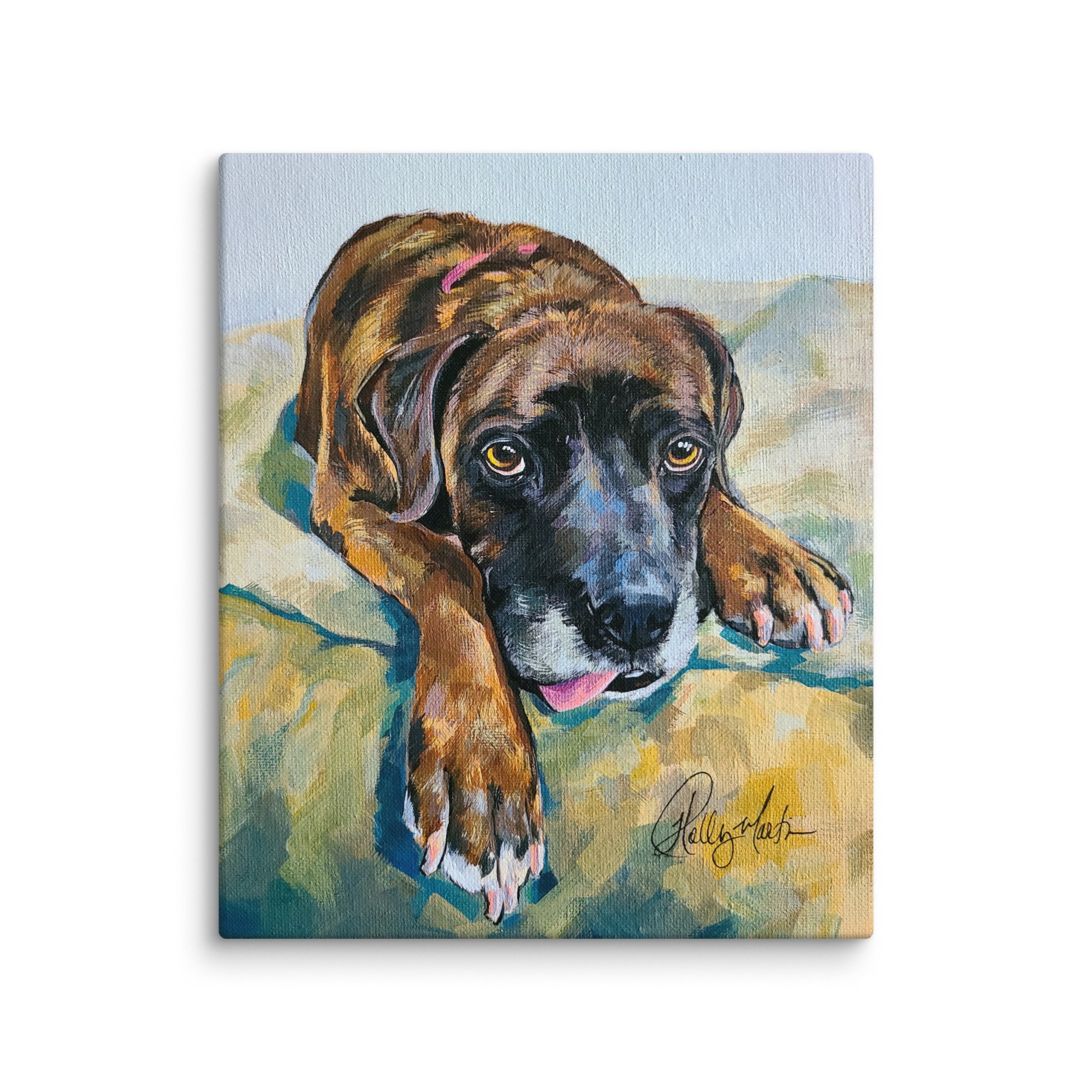 This captivating acrylic painting features a brown dog exuding a sense of tranquility and playfulness. With its soulful brown eyes gazing softly, the pup is depicted lying comfortably on a plush surface, its head nestled between outstretched front legs, and a playful tongue adorning its relaxed demeanor.
